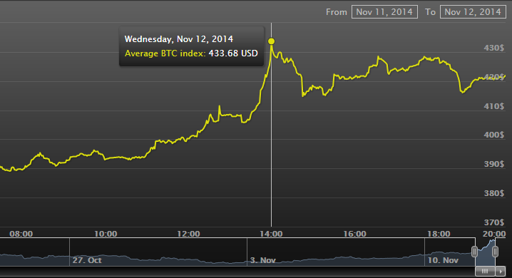 | Курс биткойна пробил отметку в $400, показав 9% роста за один день и вернувшись к уровню второй половины сентября. Первые девять месяцев текущего года курс всё время находился выше $400, не считая коротких просадок из-за сбоя на бирже BTC-E в августе и проблем с депозитами на китайских биржах в апреле. Постепенно падая с начала июля, 5 октября курс достиг отметки в $319. Октябрь определенно стал худшим месяцем для биткойна в плане его цены. К 14 октября ненадолго добрался до $398, затем упав до $350 за следующие две недели. В самом начале ноября курс держался на уровне $320-$325 до того, как начать медленно расти с 9 числа. В этот день курс вырос с $344 до $360. Не считая совсем короткой просадки 11 ноября, курс начал стремительный рост, пробив отметку в $400.